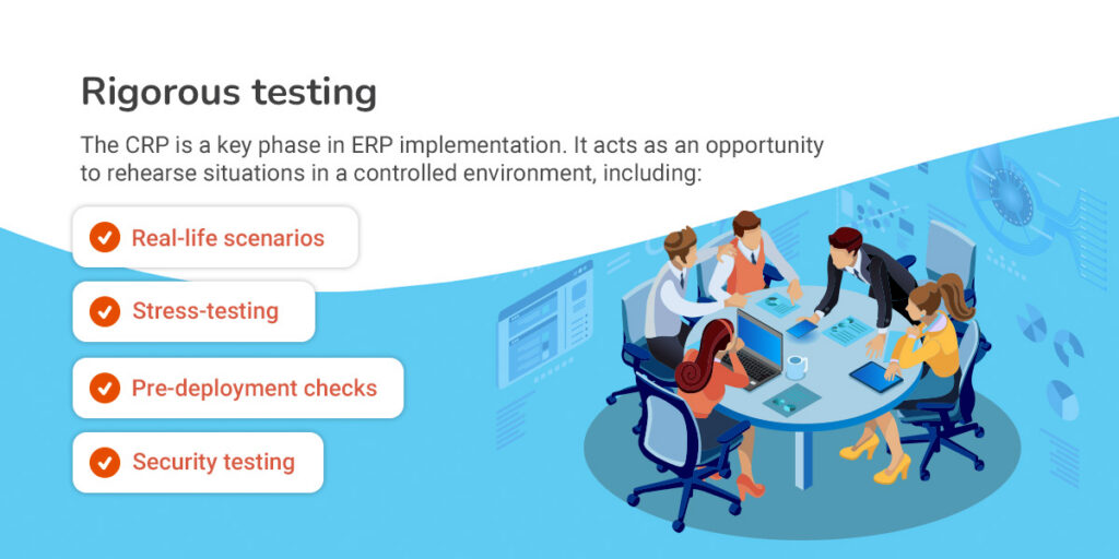 The CRP is a key phase in ERP implementation. It acts as an opportunity to rehearse situations in a controlled environment, including:
